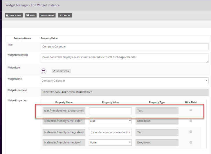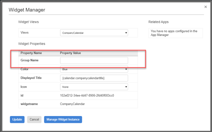 The Company Calendar connects to a group calendar in Office 365 to get its data. The name of the group calendar needs to be set either in the Widget Manager or using the front end widget edit.