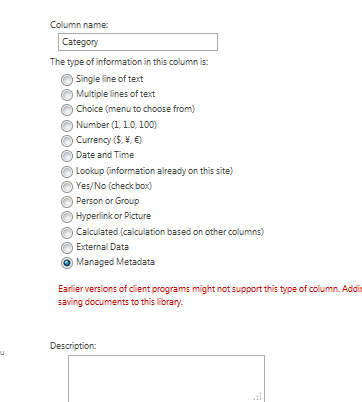 Below is an example of setting up a column of type Meta Data “Category” for the document library.