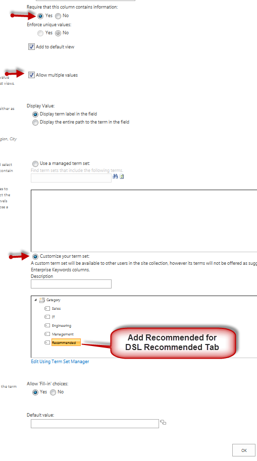 For the DSL Recommended Tab to work, the Term “Recommended” must be added to a Meta Data Column such as “Category”.