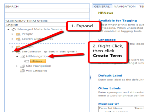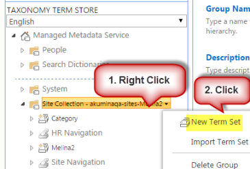 A “Term Set” is required to create an Alias/Term for Navigation, i.e. “Site Navigation”