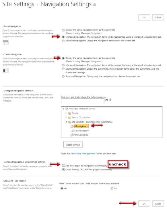 Setting Navigation Options for the Parent Site Collection