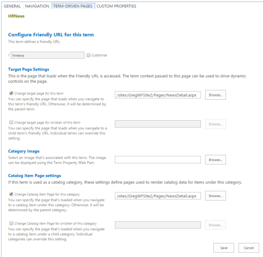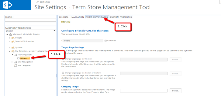 The new term “CompanyNews” will be highlighted in the left column, in the right pane click on the Tab “TERM-DRIVEN PAGES”.