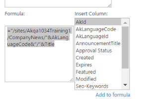 In the target list(s) that contain the content to be displayed (in our example CompanyNews_AK and DeptNews_AK), a list column called “FriendlyURL” should be created (if it does not already exist) with the following attributes: