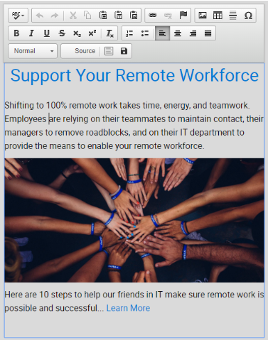 A powerful and versatile widget that allows you to create content in the AppManager or on the front end and fully edit that content on the front end. For additional details, reference Working with HTML Content Widget.