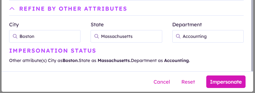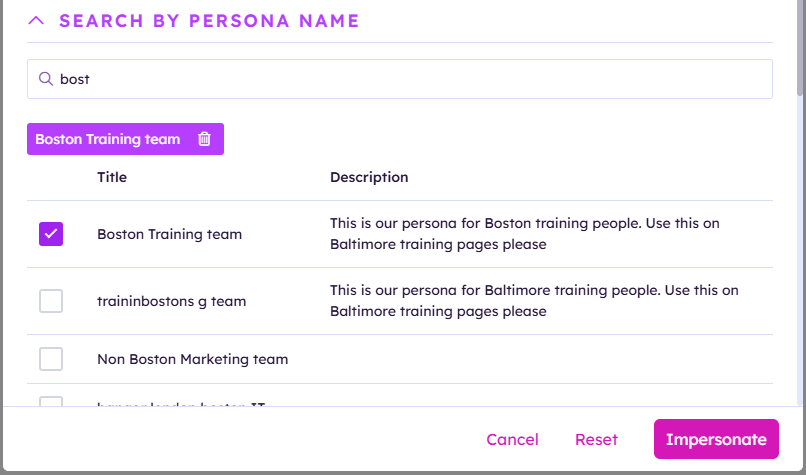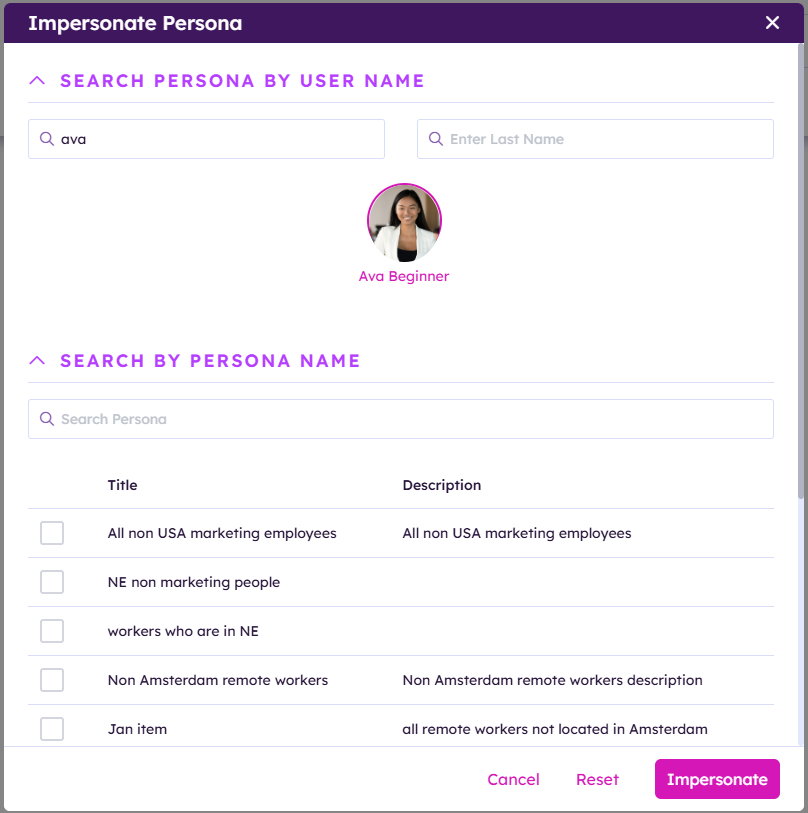 Personas can be selected by checking the box to the left of the persona name, and the impersonate filter can be refined by other attributes; choosing a city, state or department to filter against the persona selected.