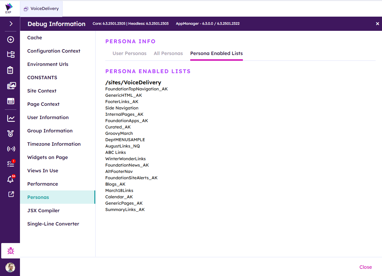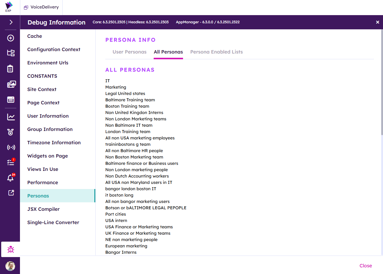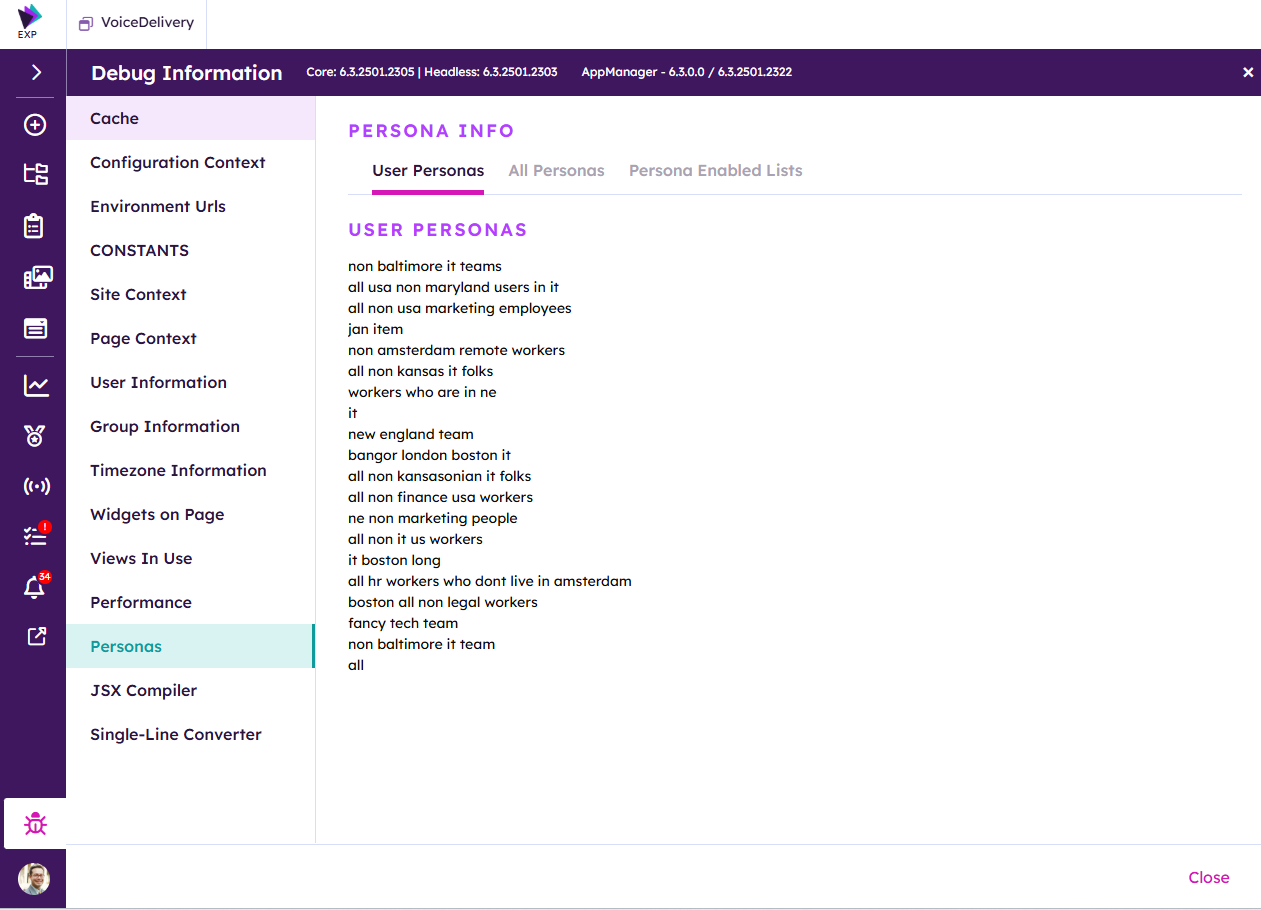 To quickly determine the available personas, click on the Debug button on the Akumina Rail.