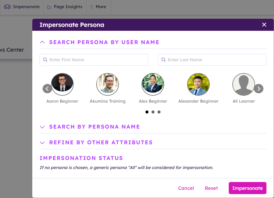 The Impersonation Engine functionality allows an authorized user to preview the content through the lens of another user (persona); navigate the entire site based on the selected persona to ensure the site is working as designed; and troubleshoot issues before publishing. Personas can be created, edited and deleted using the Persona Builder; please reference “Working with Persona Builder” section for more information on personas.