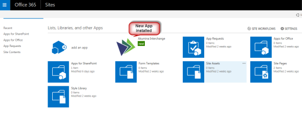 The “Site Contents” page will display where you will see your newly added App “Akumina AppManager”.