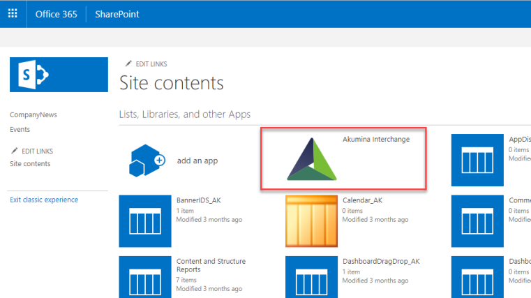 This is the most common way for users to access the AppManager once all of the setup is complete and the front-end site exists. The "Akumina Tray Icon" as well as the "My Apps" left rail item can be used to access AppManager.