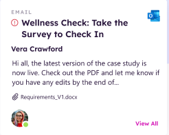View Description: A card display of the user's most recent email, complete with users avatar, title and clickable link.