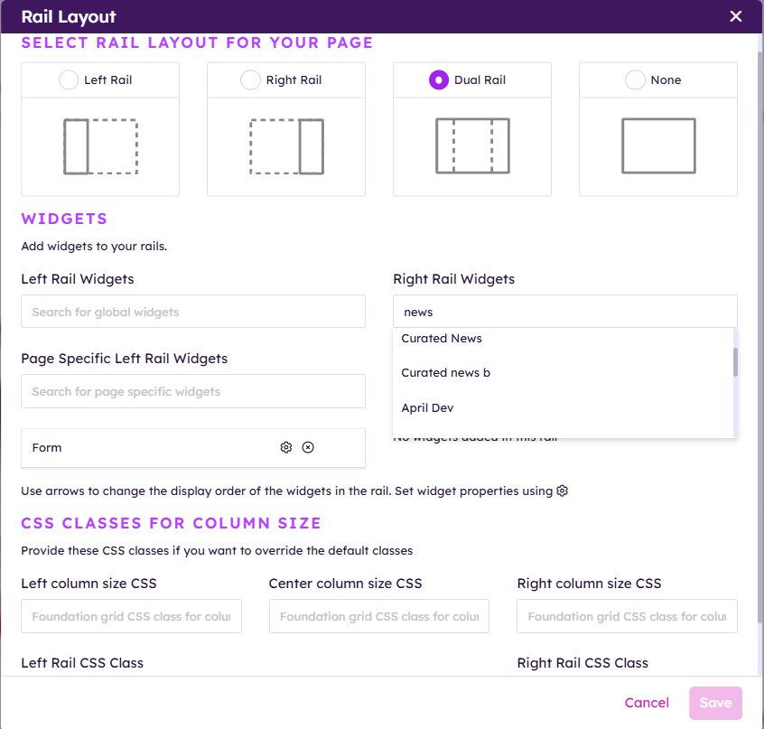 You can then add widget instances into each rail by typing in a widget instance name. It is possible to apply CSS classes to the Rail as well. Click Save when finished.