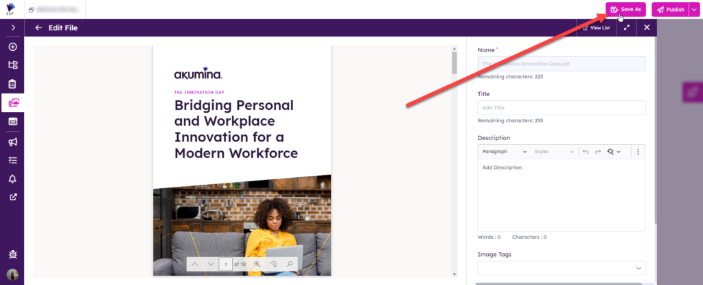 The Akumina tray has been replaced with a Content Manager Rail and includes an introduction of a new “Modules” concept as well as a NEW top action bar to handle Author actions such as “Preview, Save, Publish, Submit to Workflow” to provide a unified experience across Modules.