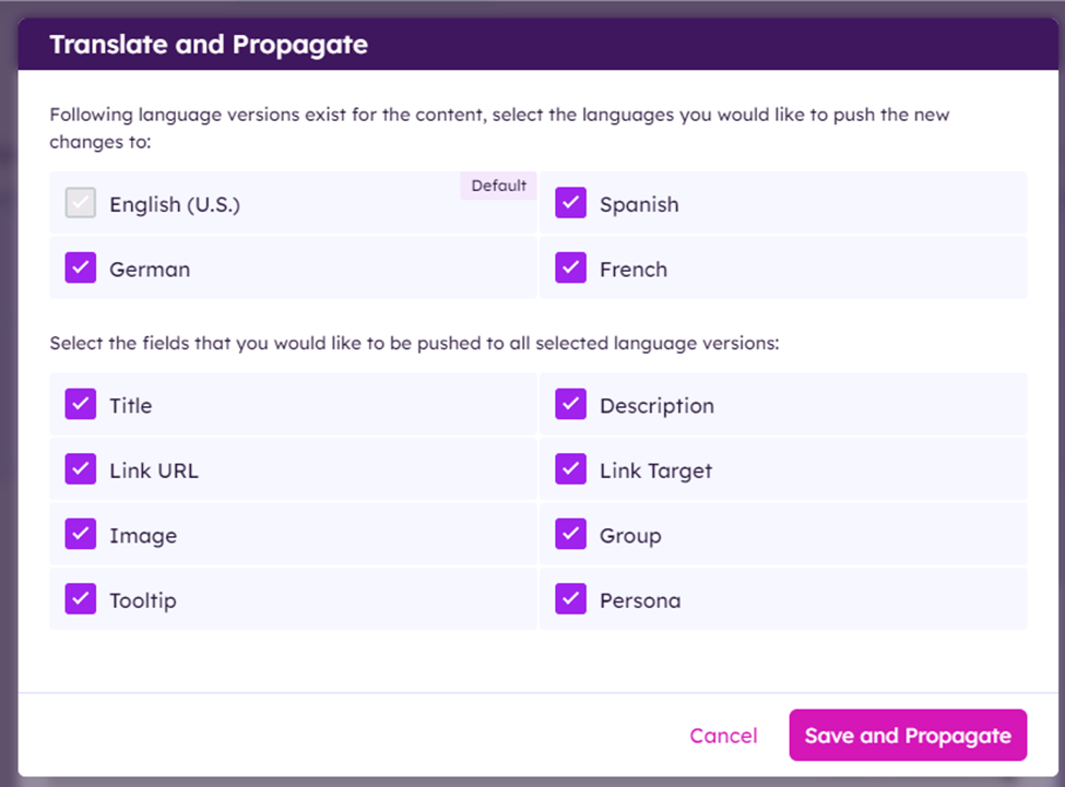 You can choose to propagate and/or translate to all languages and fields, or just to a selection of languages and fields.