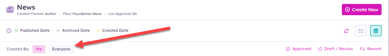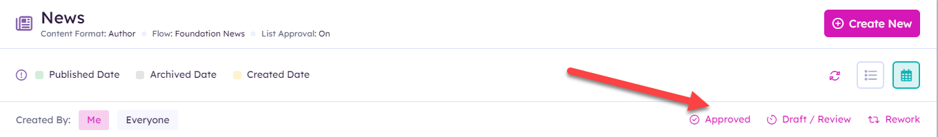 The items on the calendar can be filtered based on their status. The available buttons change depending on whether list approvals are on and whether the list is using Akumina Flows for content approval.