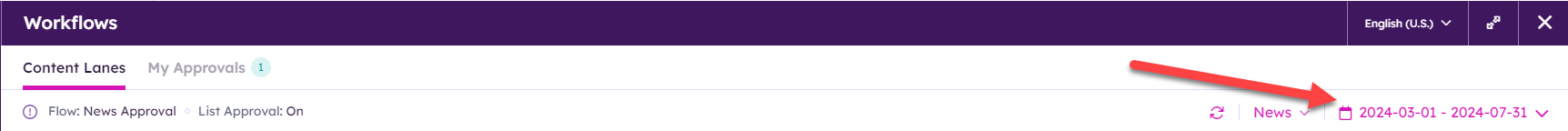 By default, Content Lanes displays articles from the current month. The date range can be customized using the date range filter.
