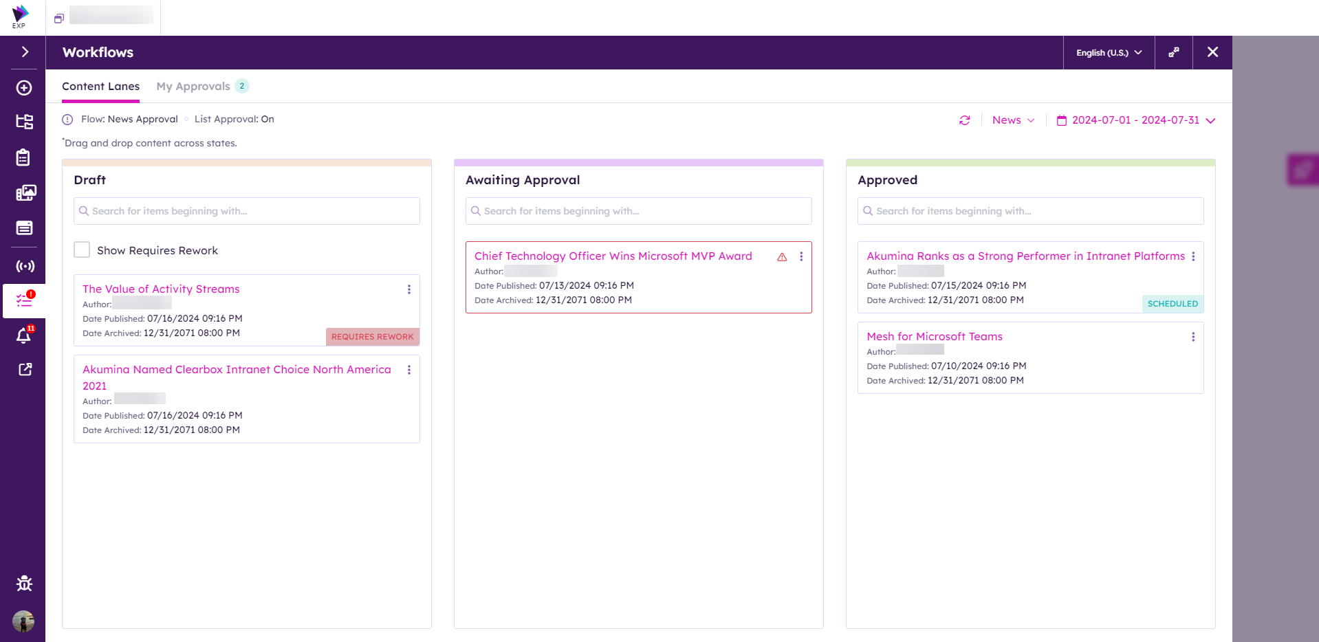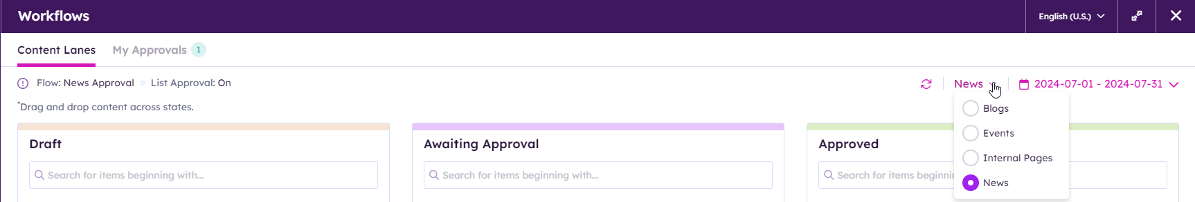 Content Lanes is a new view in the Workflows module that allows approvers to visualize the approval status of content and move it between approval states. Content Lanes also allows the approvers to visualize whether unapproved content is past its publish date.