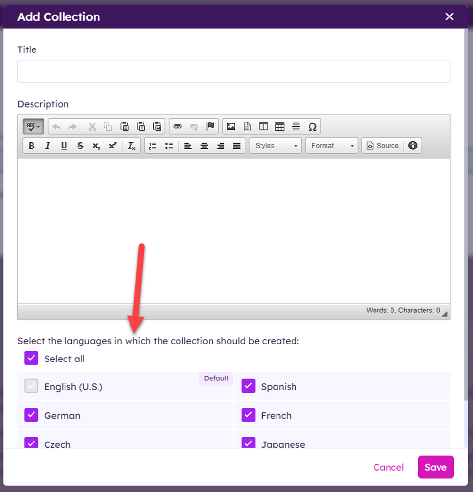 Language versions can be added after creating the collection by clicking the globe icon next to the collection.