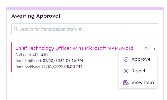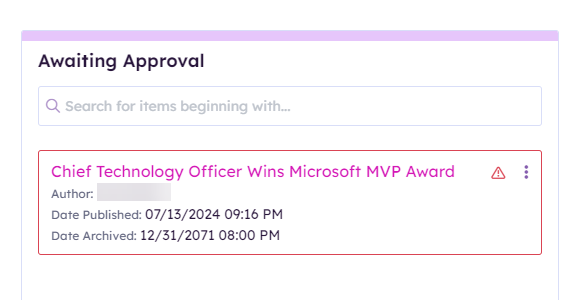 If an item is not approved and its publish date has passed, there will be a red border and warning icon applied to the card to alert the approver.