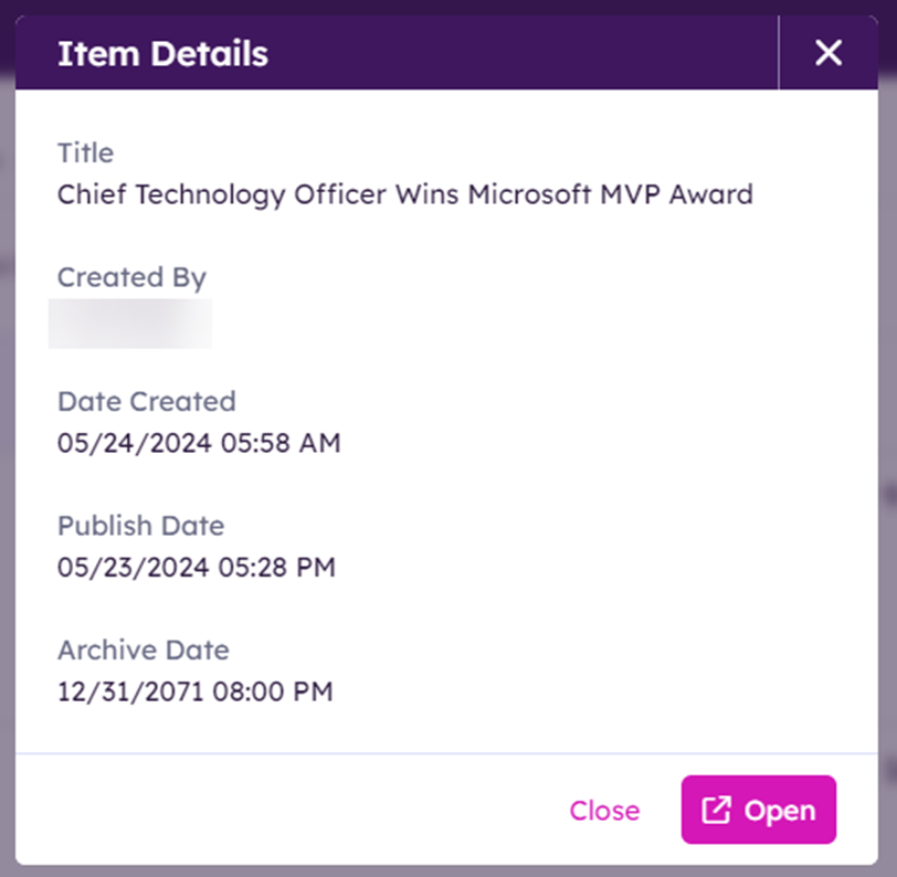 Clicking on an item in the calendar allows you to view its details, such as the creator, date created, publish date, and archive date. From here, you can click the ‘Open’ button to edit the content.