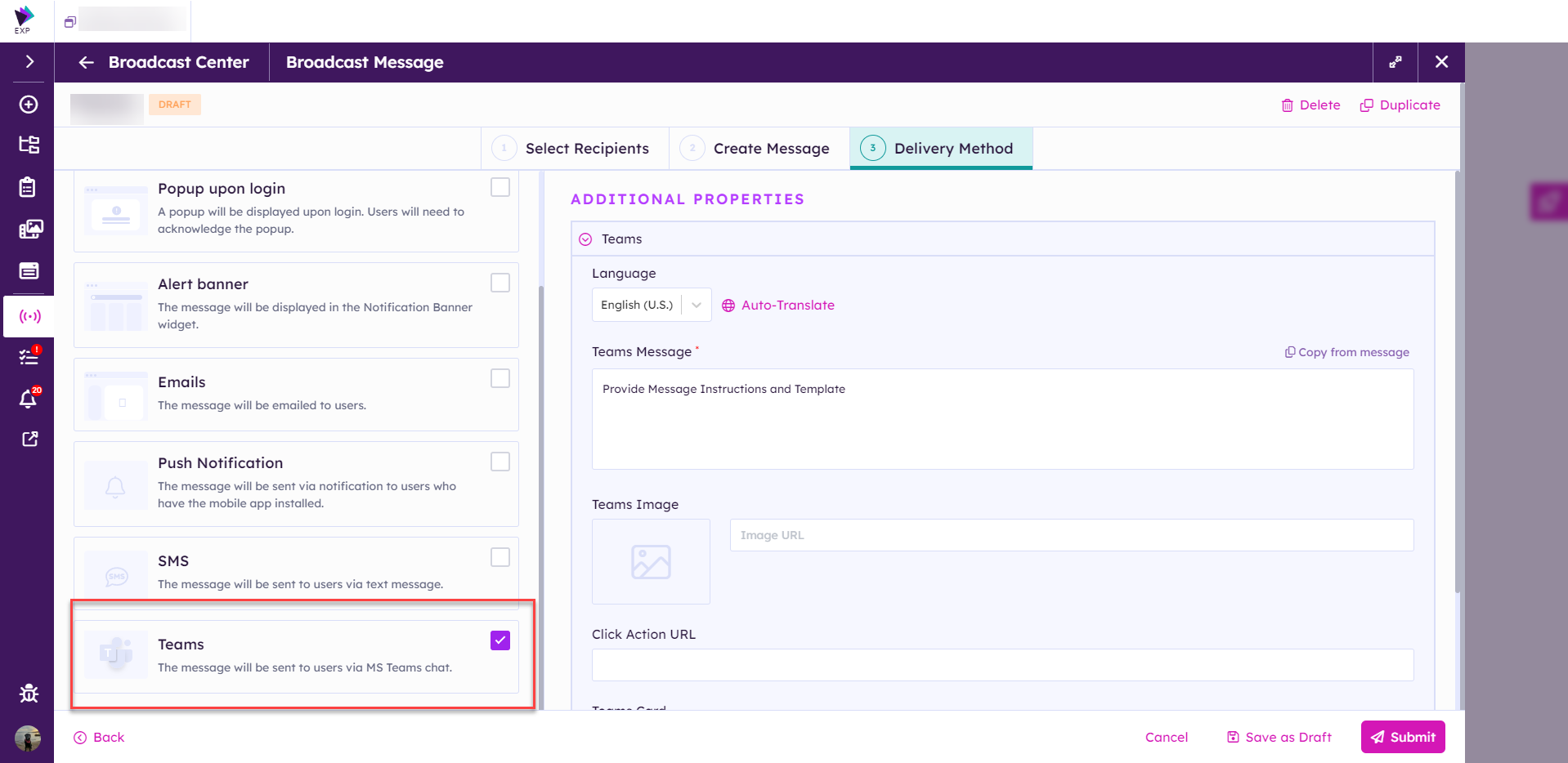 A new Teams delivery option has been added to the Broadcast Messages. Configuration is required to use this feature. Please contact Support for configuration details.