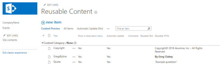 To enable Reusable Content within the Akumina solution, the following options must be set by the System Admin in the DigiSpaceConfigurationIDS_AK list (or set in Site Creator when deploying the site):To start using Reusable Content, the items to reuse should be first added to the specified Reusable Content list. The Resusable Content defined in the root of a site collection is also available to use in any of the subsites.