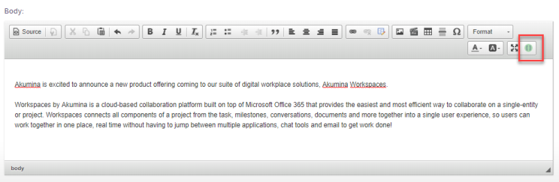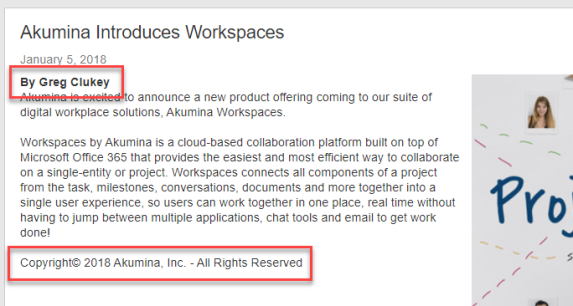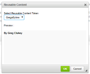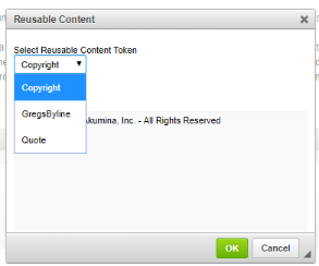 Selecting an item and clicking “OK” will insert a token for that item at the current cursor location in the editor. In the following example, we have inserted two Reusable Content tokens (one at a time) into our content. One for the byline, and one for the standard company copyright language.