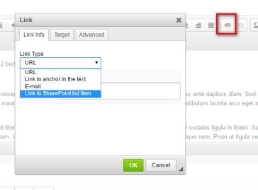 This functionality allows a content editor, using the AppManager rich text editor, to browse a specified set of SharePoint lists/libraries in the current site, select a list item, and have a link to that item be inserted into the current text area. This alleviates the need to separately browse the item to grab the link, then copy and paste the link into the editor. This is also consistent with the ability to browse for and insert an image into the content editor.