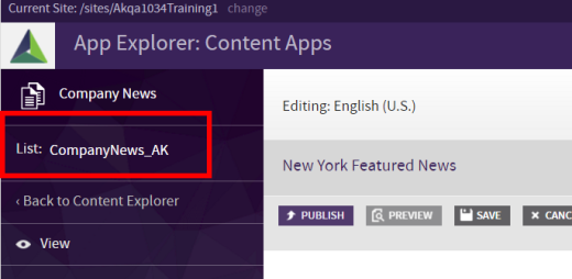 As a setup and configuration tool for administrators, when in a content item in any Content App, an indicator in the left rail displays the name of the SharePoint list that the Content App is using.  Clicking on the list name will launch a new window with the SharePoint list open.  These links only appear for users in the Administrators Group for the AppManager.