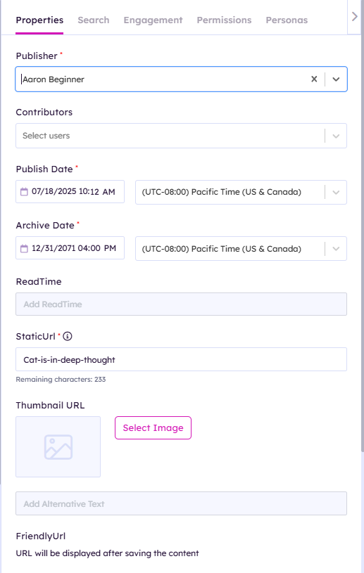 | StaticURL | Automatically is generated from title, can be modified. Will be used by FriendlyUrl. |