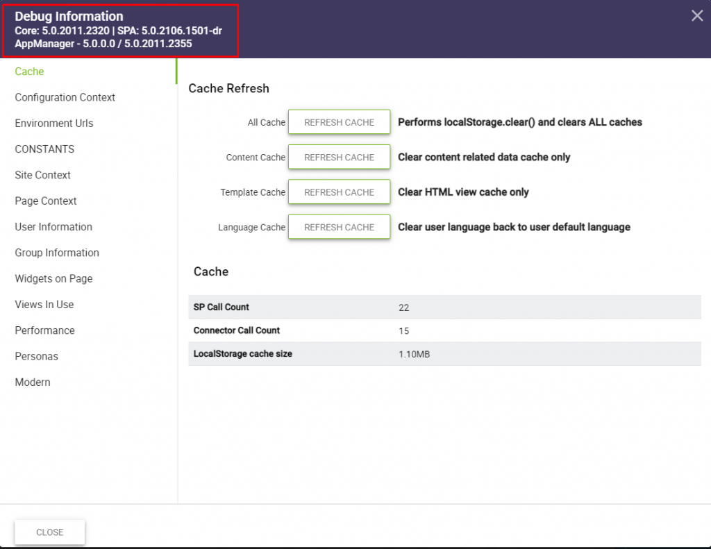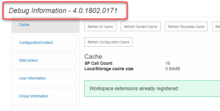 To obtain the Akumina versions from the debug panel from the front-end site, click on Ctrl+uparrow or select the debug button from the Akumina tray.