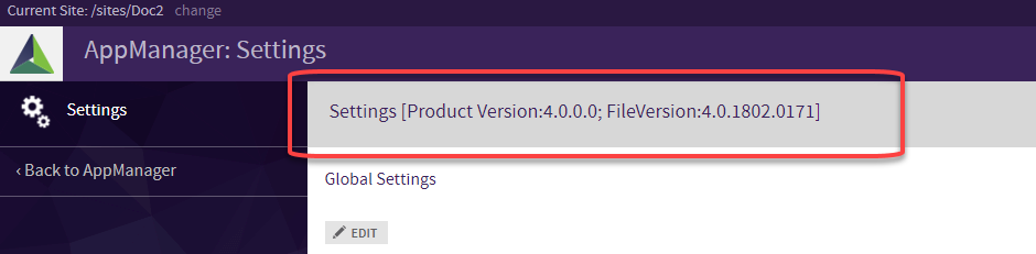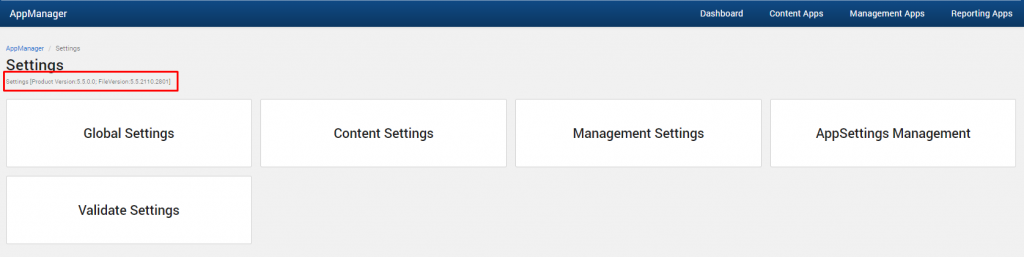 Once logged into the AppManager, check the version number by going to the settings area using the settings drop down (4.5 and above) or gear (4.1/4.0) in the top right corner of the AppManager. You will see the AppManager file version listed at the top of the panel.