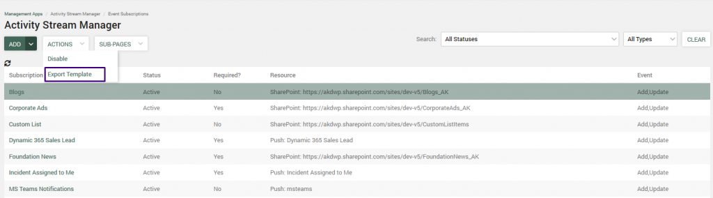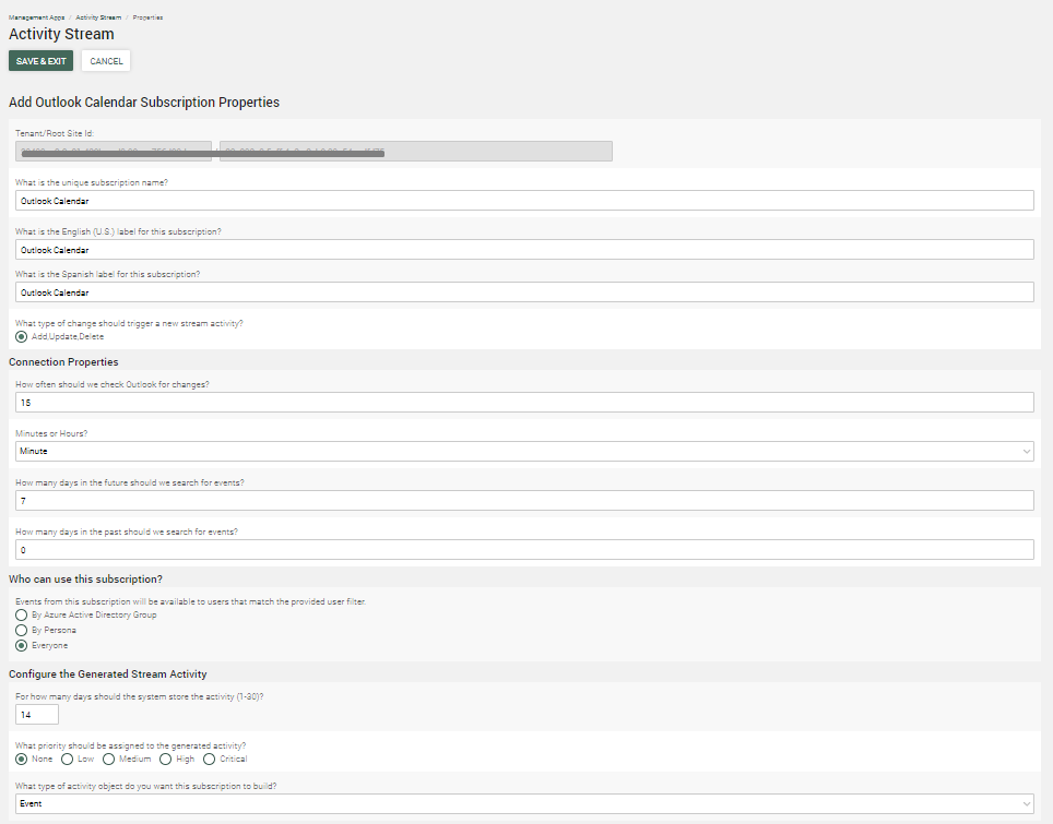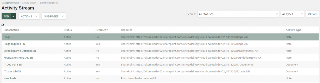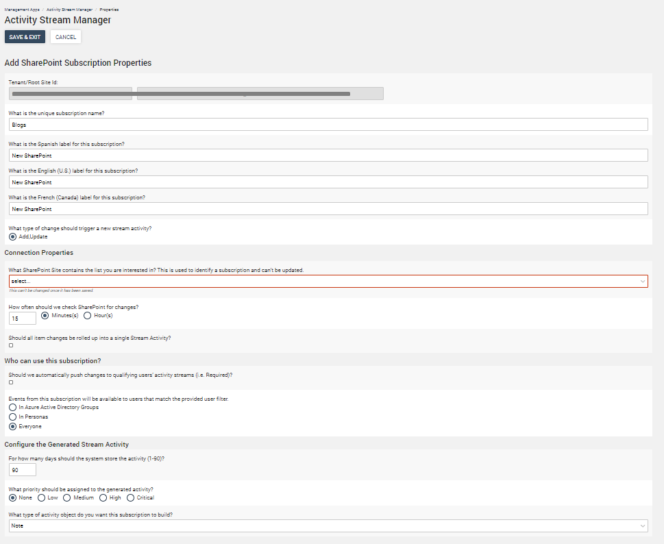 A new Activity Stream Manager management app has been added with Release 5.0 to provide a configurable feed experience with M365 and 3rd party providers. The Activity Streams Manager allows for a subscription with the provider system based on event types to push current site information and customized feed subscriptions to users.