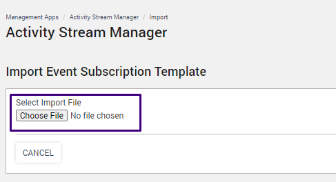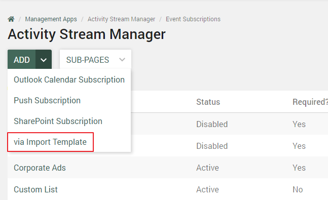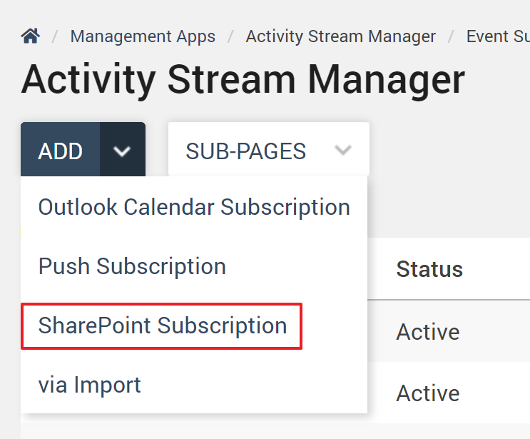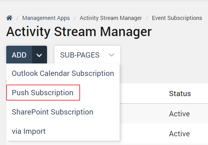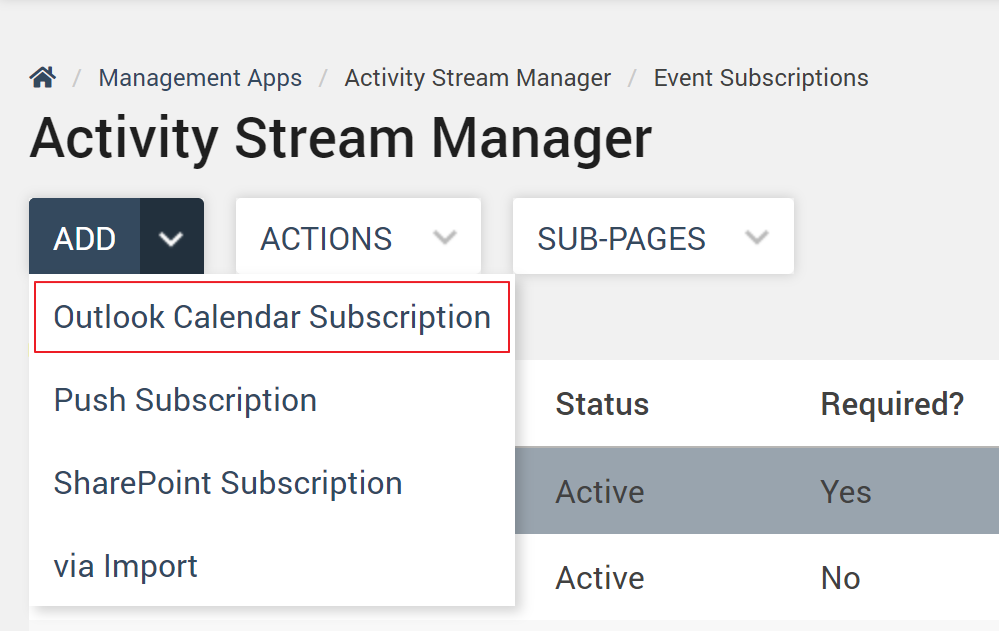The Activity Stream Manager management app provides functionality to add, edit, and customize activity stream event subscriptions.