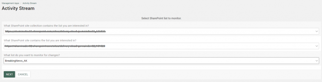 | What SharePoint site collection contains the list you are interested in? | Select the SharePoint site collection where the list is contained. |