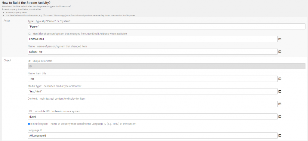 | Activity Stream Actor/Object Model | SharePoint Column or Literal Entry Model Note: For each property listed below, provide either: (1) a source property name or (2) a literal value within double quotes, e.g. "Document" |