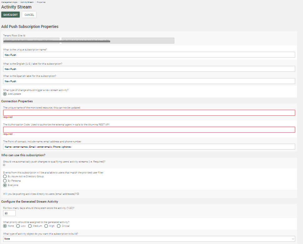 | Should we automatically push changes to qualifying users’ activity streams (i.e. Required)? | If checked, the subscription will display on the user's activity stream, and users will not be able to opt out by deactivating it in the Activity Stream Configuration settings screen |