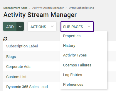 Activity Stream Manager Sub-Pages are used to build out subscription cards, provide a list of Cosmos Database failures, log entries, and preferences. Click here for details on Working with Activity Stream Manager Sub-Pages.