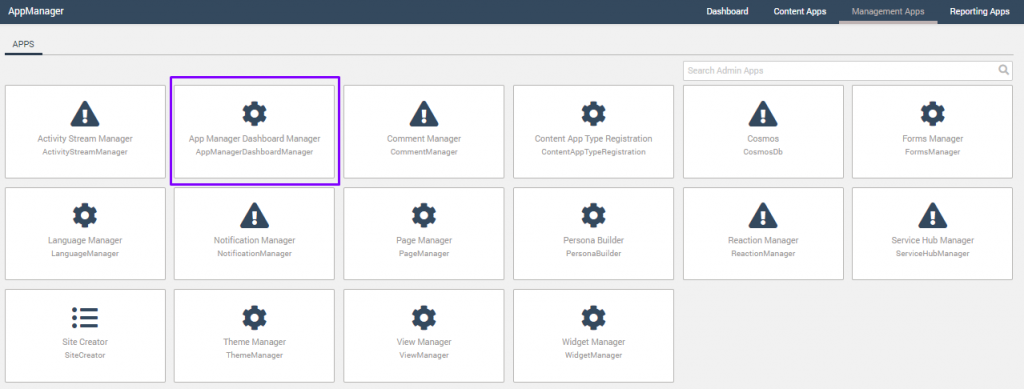The AppManager Dashboard Manager Management App comes with defaulted AppManager Widgets for the top and main section of the AppManager Dashboard page. The top section is reserved for count widgets for statistical purposes and the main section is reserved for detail reporting widgets for analytics purposes. Click here to learn about the AppManager Dashboard page.
