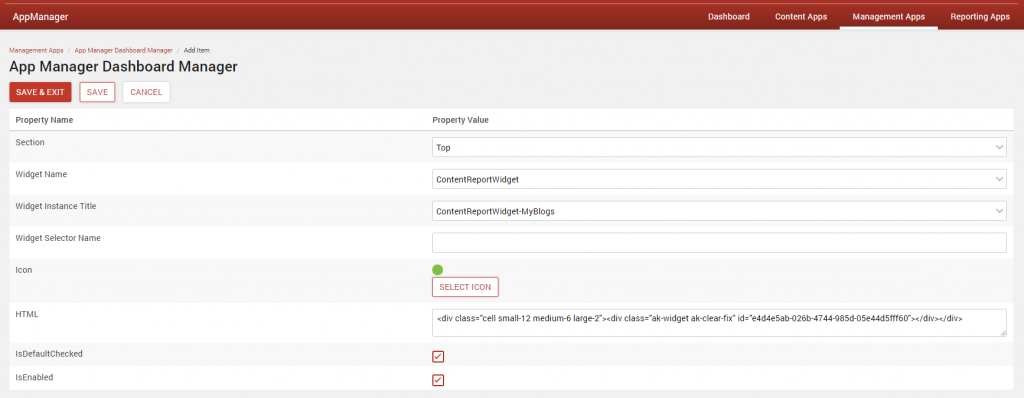 | Is Enabled | If checked, the widget will be enabled on the pop-up screen modal on AppManager Dashboard |