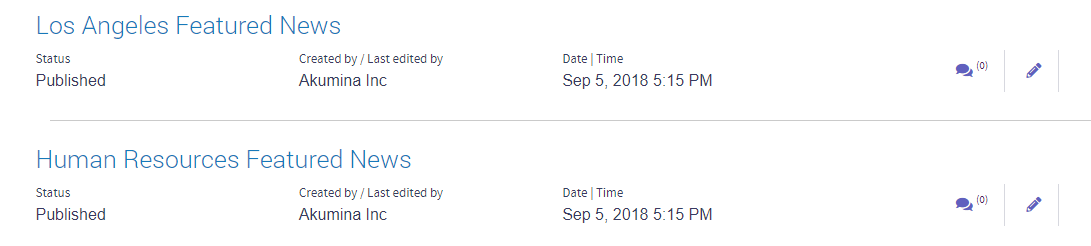 As an example, let’s look at launching the “Department News” app to edit a specific news article. Double clicking the Department News content app icon will open the following screen with the list of content associated with the app: