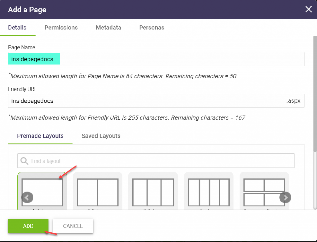 On the "Add a Page" modal enter the page name for our template in this case insidepagedocs, pick the layout to be a "1 Column" for greatest flexibility, and Add.