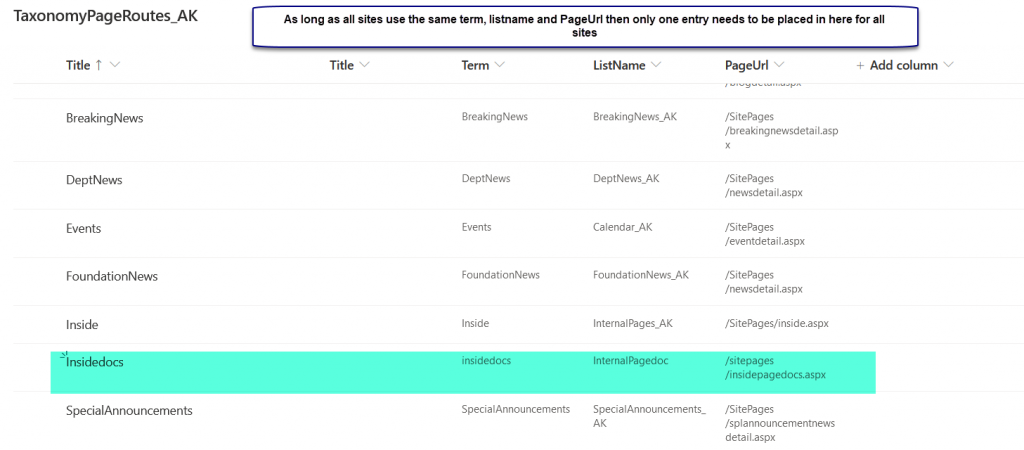In a modern site the page navigation is managed on your central site collection (or standalone) in the list "TaxonomyPageRoutes_AK" a new item needs to be added to this list for the new navigational term in this case insidedocs. If you are adding the same page templates to all of your delivery sites and subsites and as long as you keep your pages with the same relative path page url and pointing to the same name supporting SharePoint list then you only have to create one entry in here for all sites.