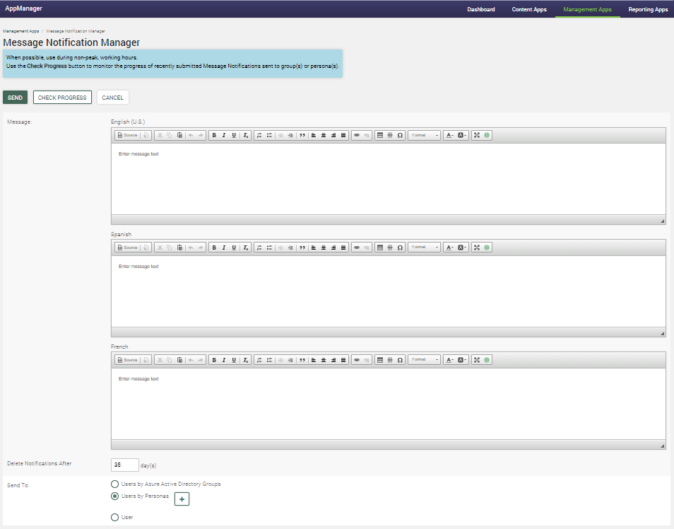 The Message Notification Manager provides standard inline editing capabilities to create a message. For multi-lingual enabled sites, message fields are available for each supported language.