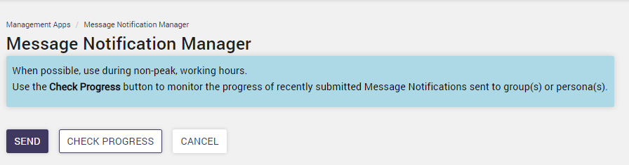 Please note for Notification Messages to Groups or Personas, the Message Notification Manager should be used during non-peak working hours.