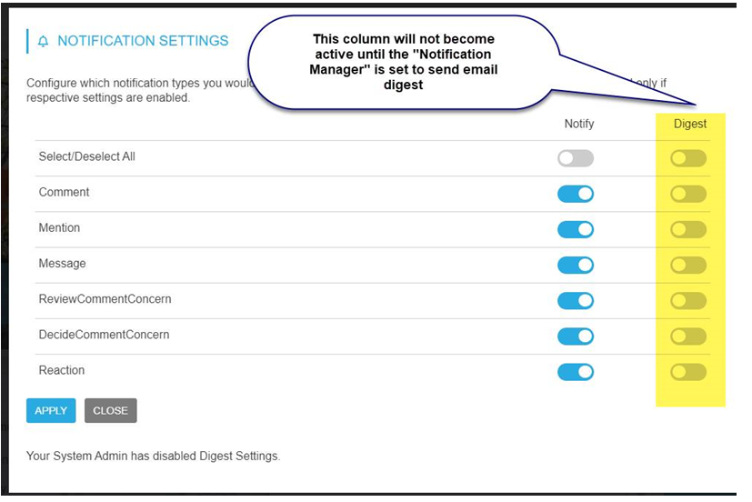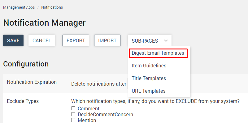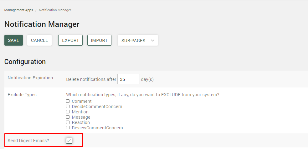 The Notifications configuration screen provides the ability to configure the type of notifications for the organization, import/export notifications, and send digest emails.
