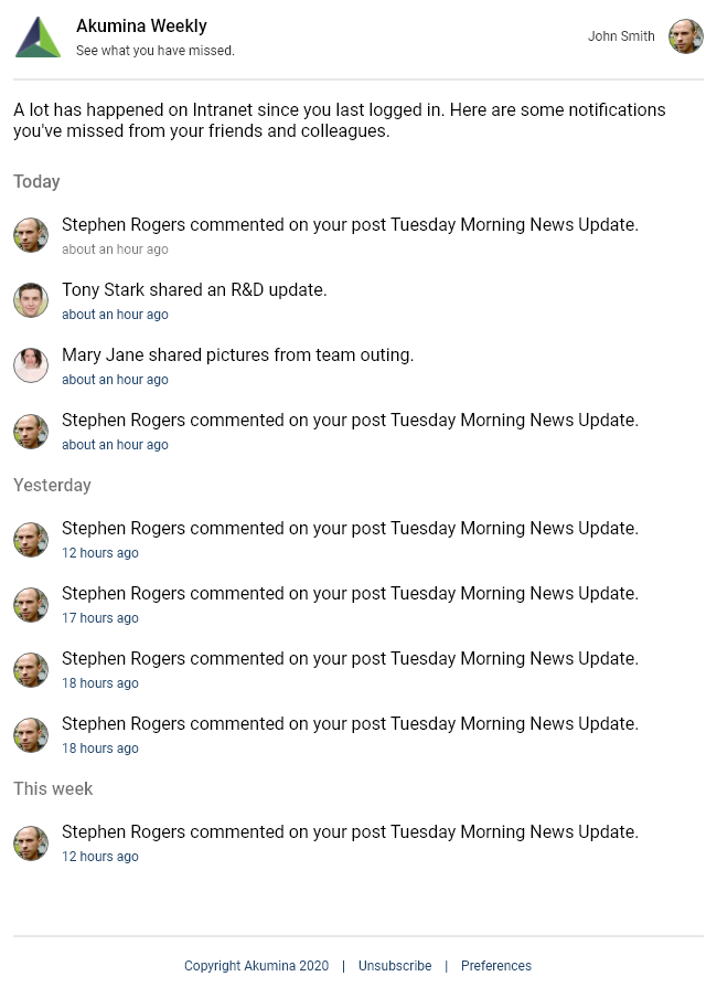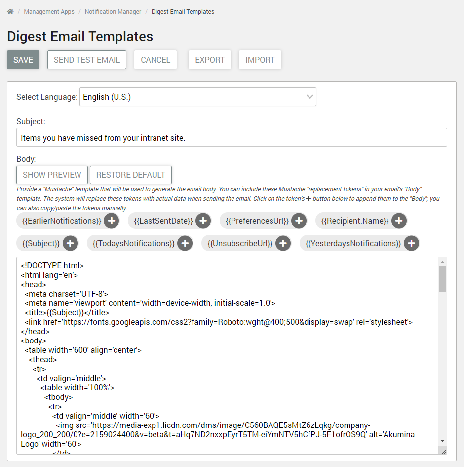 The Notification Digest Email Templates provides the ability to surface unread notifications to users in a customized email format.