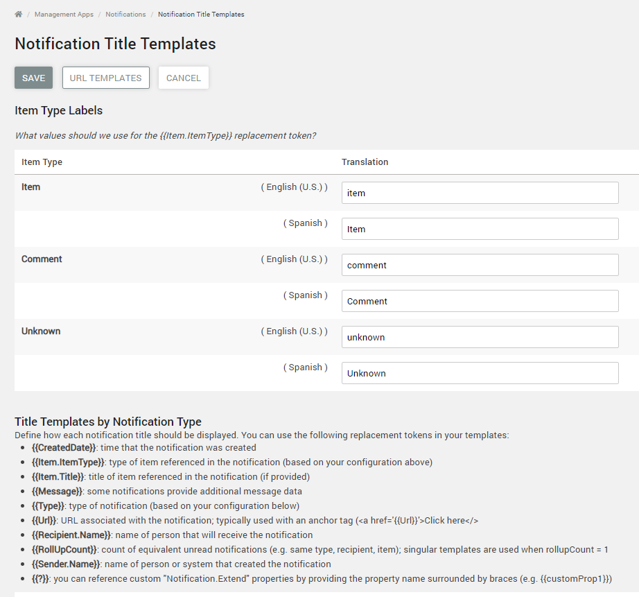 Title Templates control how notification titles display in the notification panel and email digests. They are built to work with multilingual and configured on the Notification Title Templates screen.