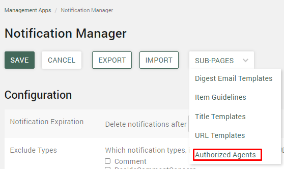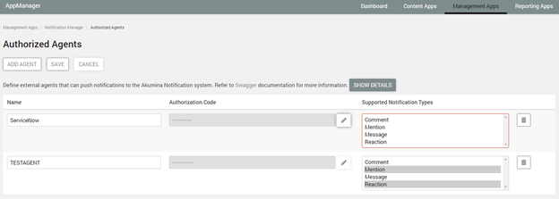 The Notification Authorized Agents provides customers with the ability to authorize third party agents, such as Service Now, to be integrated into the notification bell to enable corporate wide multi-lingual notifications for the site.