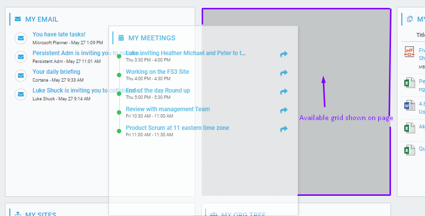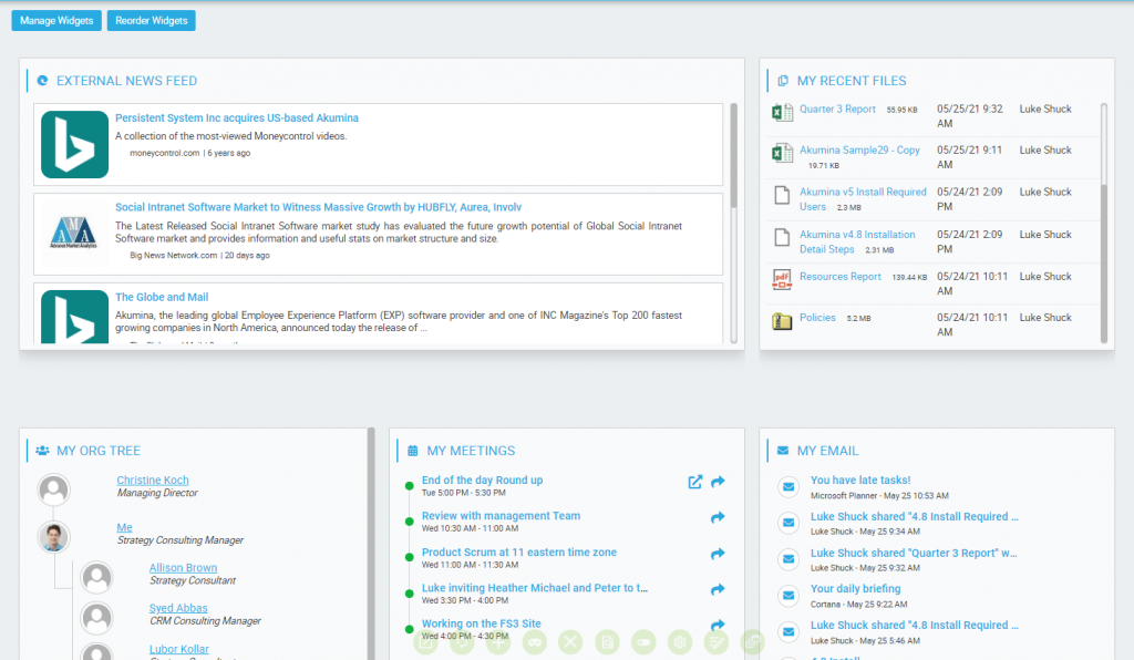 The Employee Dashboard allows end users the ability to create a personalized user defined dashboard page based on their selection from multiple available widgets; and define their page layout preferences.