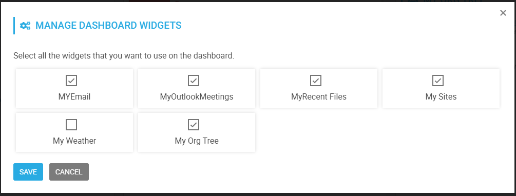Click on the check box to select the widgets that you want to appear on the Dashboard.